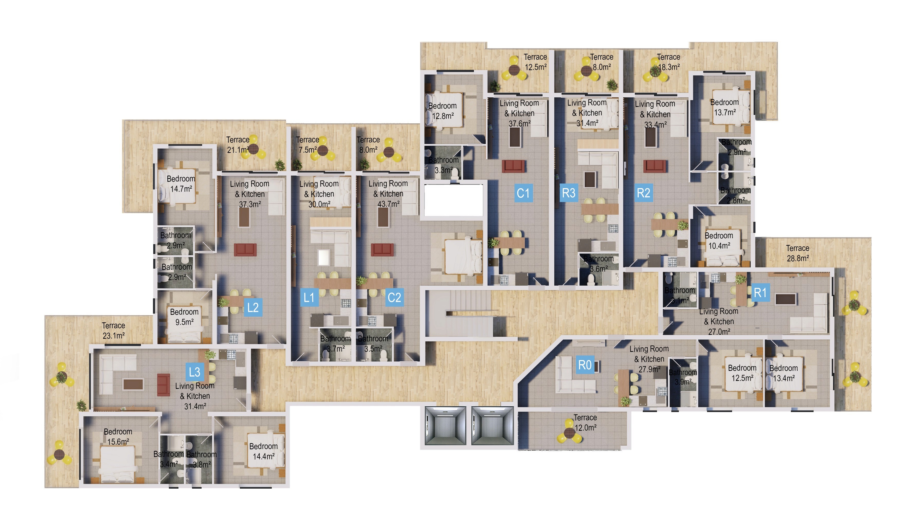 The apartments, ranging from studios, 1+1, 2+1 to penthouses, are crafted with premium materials, ensuring the interior matches the prestige of the exterior.